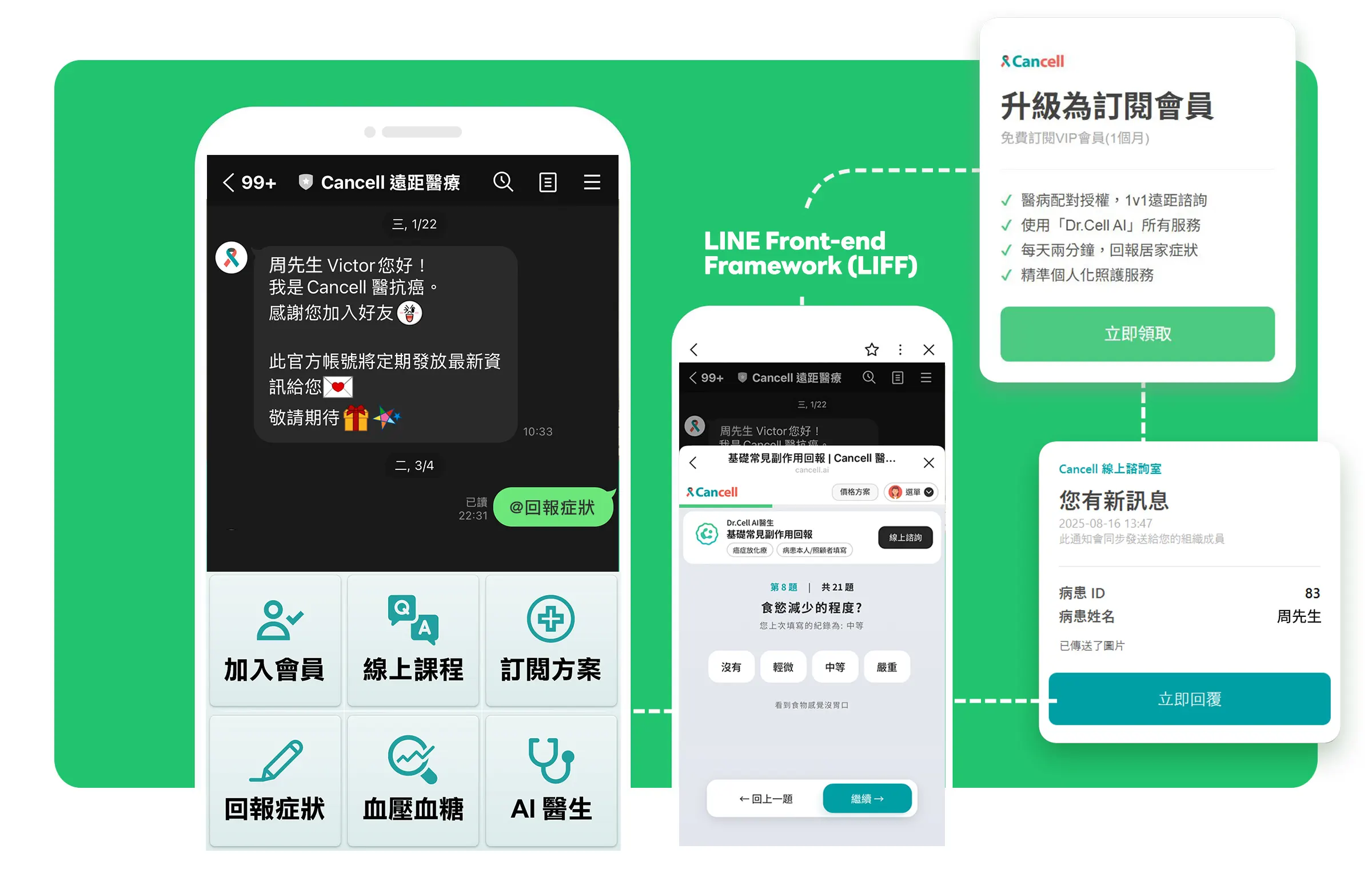 Cancell 將各大核心功能模組化為「隨插即用」的 LINE 小工具,讓B端客戶自由搭配,無痛升級照護服務。只要在熟悉的 LINE 裡面,就能用好用滿,醫護溝通零時差,無縫整合您既有的 LINE 官方帳號。